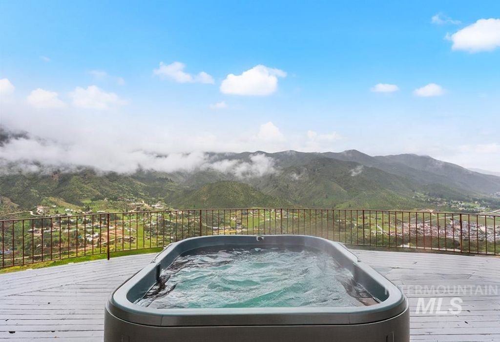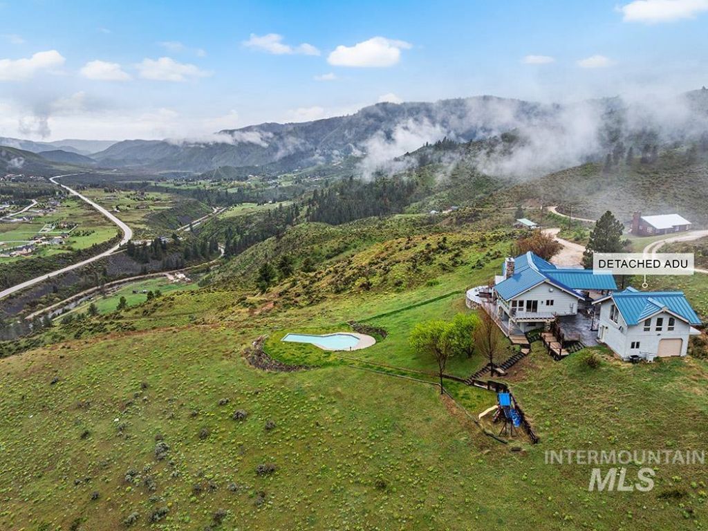 Experience over 17 acres of true Idaho living, just 35 minutes from Boise with sweeping views of the Sawtooth Mountain Range in every direction! This charming mountain estate offers a spacious main residence and a flexible guest house/ADU. A resort stylpool overlooks the endless mountain range. The interior features hardwood flooring, intricate mahogany woodwork, cathedral ceilings with exposed wood beams, and expansive architectural windows that frame the natural landscapes. Main-level master suite features direct balcony access, dual walk-in closets, and spacious en suite bathroom. On the lower level, enjoy a vast bonus room with a wet bar, a cozy library, three additional guest bedrooms and a newly renovated bathroom. The elevated guest house offers open-concept living, dining, and kitchen area, a secluded bedroom, and a full bathroom. Minutes from hiking, biking, hunting, & Lucky Peak dock access. HOA maintains roads for year round ease. Steel roof with 30 yr warranty & 500 gal propane tank.